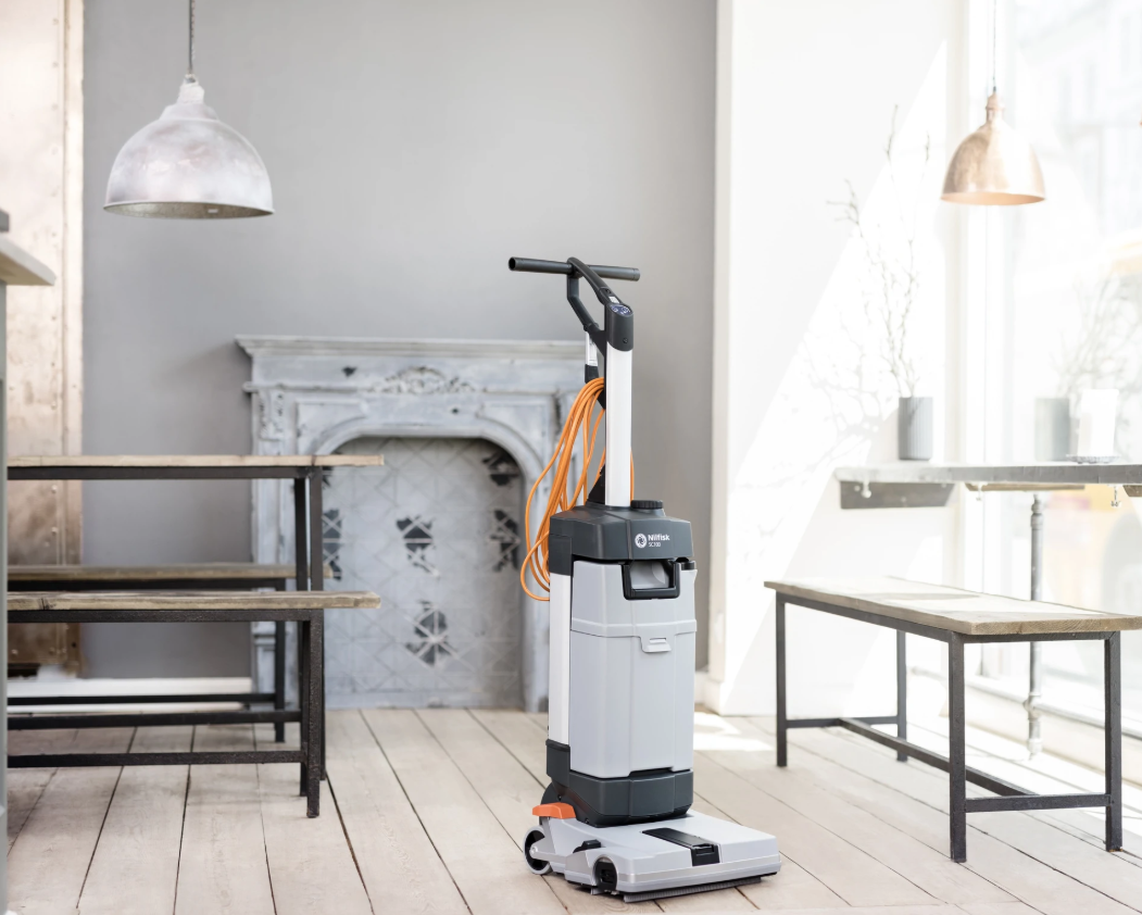 Die Nilfisk SC100 ist eine kleine Scheuersaugmaschine für die Tiefenreinigung von engen Bereichen. Im Vergleich zur manuellen Reinigung mit Wischmopp und Eimer, erledigt diese kompakte und aufrechte Maschine den Job viel schneller und bietet eine überzeugende Reinigungsleistung. Komfortabler geht es nicht.
